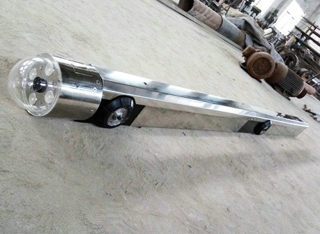 管道内观察机是一台机、电、讯、光一体化的自动观察作业小车,包括摄像观察机头和机身两大部分。机头分为旋转和固定两部分。机身包括变径调节机构、机载收发信号系统、机载控制系统、蓄电池组和驱动行走机构。机头旋转部分内装摄像机和云台,由电机带动可向右摆动90度。机头固定部分内装电机及传动机构,能带动机头旋转部分转动360度。机身前端通过燕尾式插槽、插板与机头连接成一体。变径调节机构采用燕尾滑板、滑道结构,用丝杠、丝母调节机头上、下移动处于管道中心。驱动行走机构在机身后部,其余在机身前部和中部。主要用来观察管道焊缝内表面缺陷和管内有无异物及施工质量有无问题,以便及时处理。